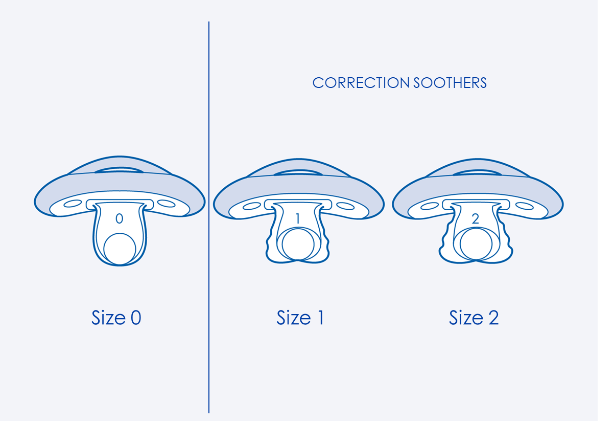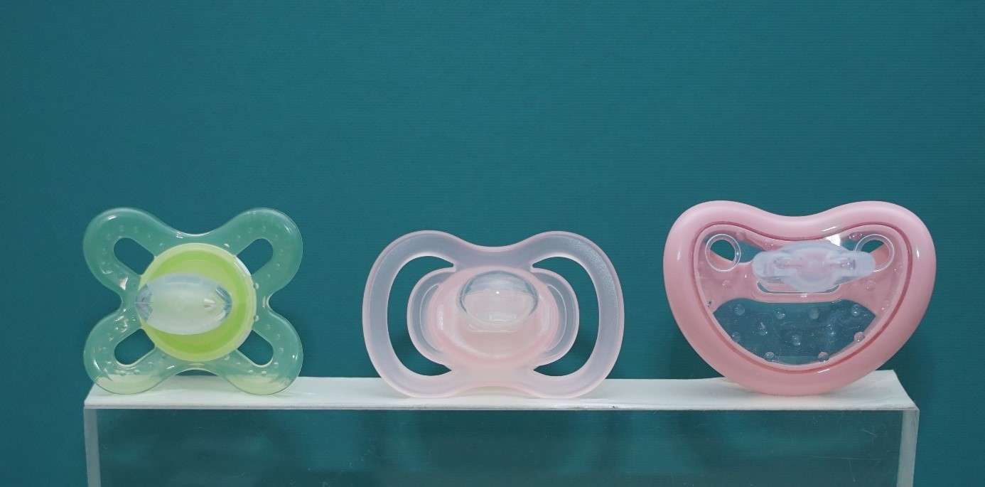 Megfigyelhetők a különböző formák és méretbeli különbségek (csomagoláson szereplő cumik balról jobbra: 0-2 hónap MAM cumi, 0-6 hónap Babydream cumi, Curaprox 1. cumi)