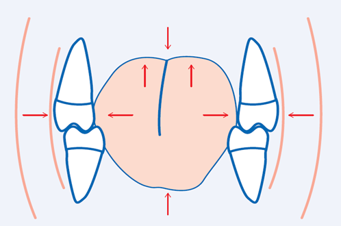 A lapos cumit a felső állcsontra préseli a nyelv, a félkör alakú középső terület a nyelv későbbi ideális helyének megfelelő területen ingerli a nyelv hegyét, az ajak és a nyelv együtt erősödik a cumi szájban tartásával, a cumi nem tartja hátulsó kényszerpozícióban az alsó állcsontot. A félkör alakú terület a nyelv középső részét lefelé nyomja, amely a nyelv hegyét felfelé, a későbbi metszők mögötti területnek megfelelő tartásnak megfelelően erősíti. A cumi hozzáér a felső állcsont fogaihoz az első tej őrlőkig, formája nem csupán lapított kör vagy ovális szerű, hanem lekerekített háromszöghöz hasonlít. (Filippi et. al., 2015).