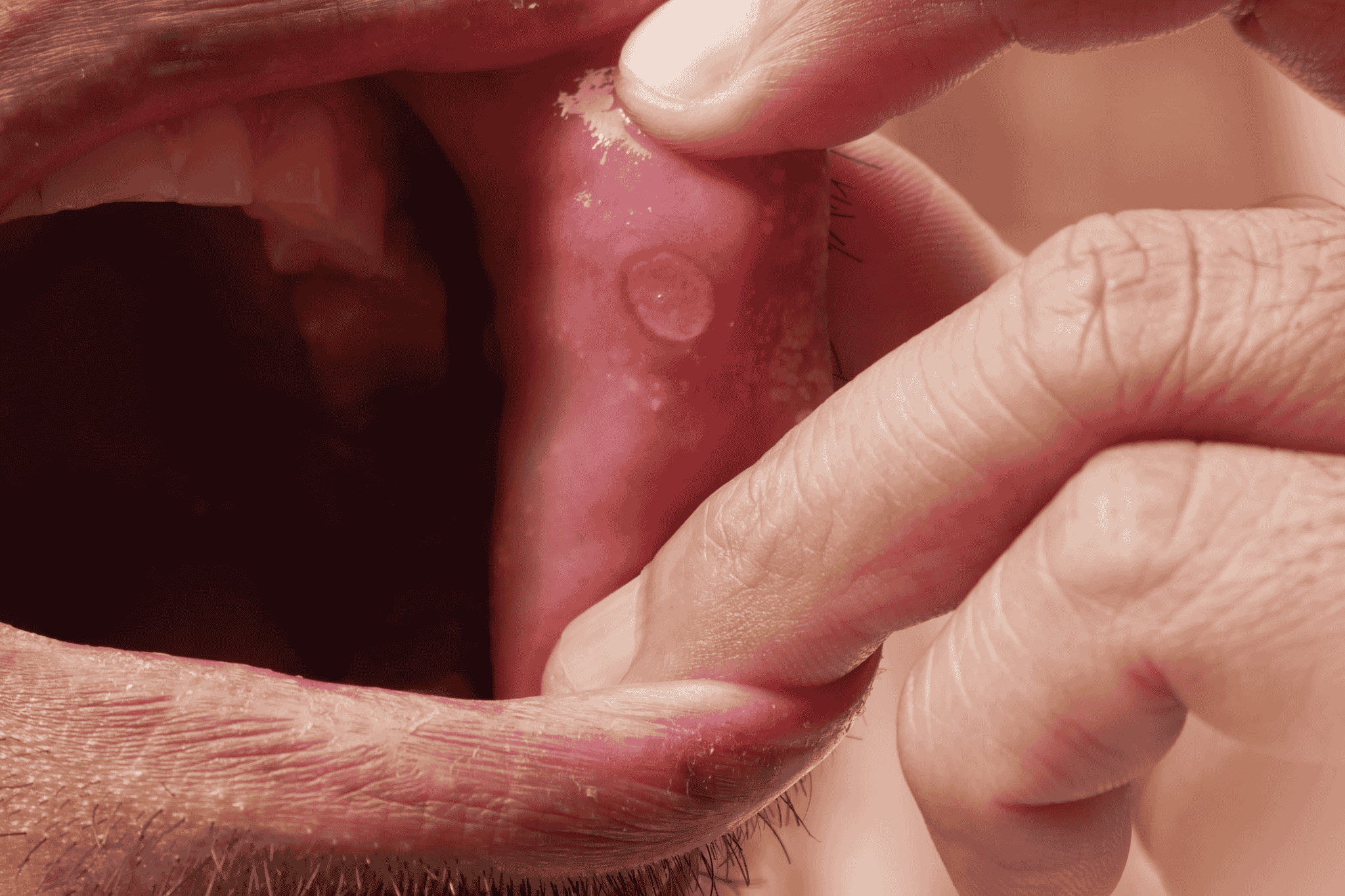 - Fehéres, piros szélű fekély a szájnyálkahártyán.