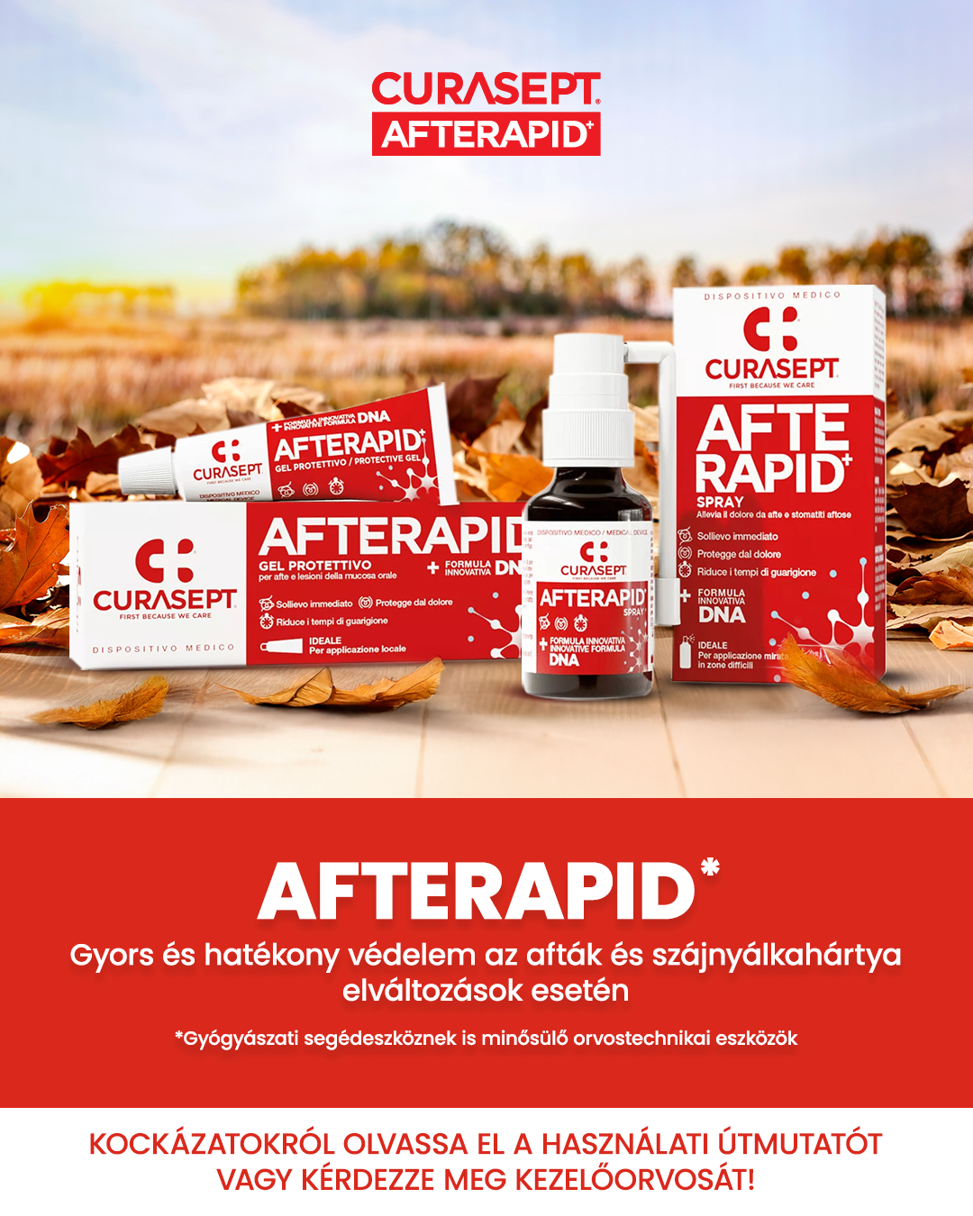 Az őszi immunterhelés idején az afta gyakrabban alakulhat ki, de nem kell, hogy hosszú napokra megkeserítse az életed. A Curasept Afterapid* gyorsan csökkenti a fájdalmat, támogatja a gyógyulást és megbízható segítséget nyújt a nyálkahártya védelmében. Így az őszi kihívásokkal is könnyebb mosolyogva szembenézni!