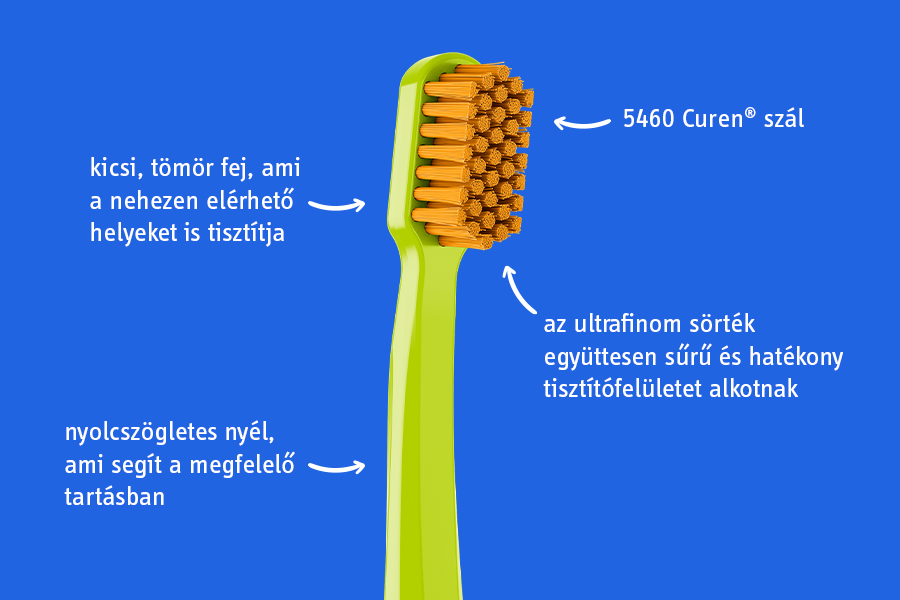 Úgyis bemutathatnánk, mint a plakk legkeményebb ellenfelét, hiszen 5460 szállal veszi fel a harcot a lepedék ellen. Miért jobb hagyományos társaihoz képest? Nejlon sörték helyett a Curaprox CS 5460 fogkefe speciális Curen® szálakat tartalmaz, amelyek rendkívül puhák, lekerekített végűek. Ezek a szálak fogmosás közben, nedvesen is ugyanúgy megőrzik tartásukat, mint szárazon. Egyetlen mozdulattal több lepedéket távolítanak el a fogak felszínéről, anélkül, hogy felsértenék az ínyt.