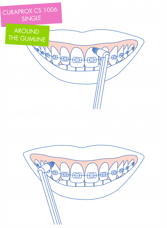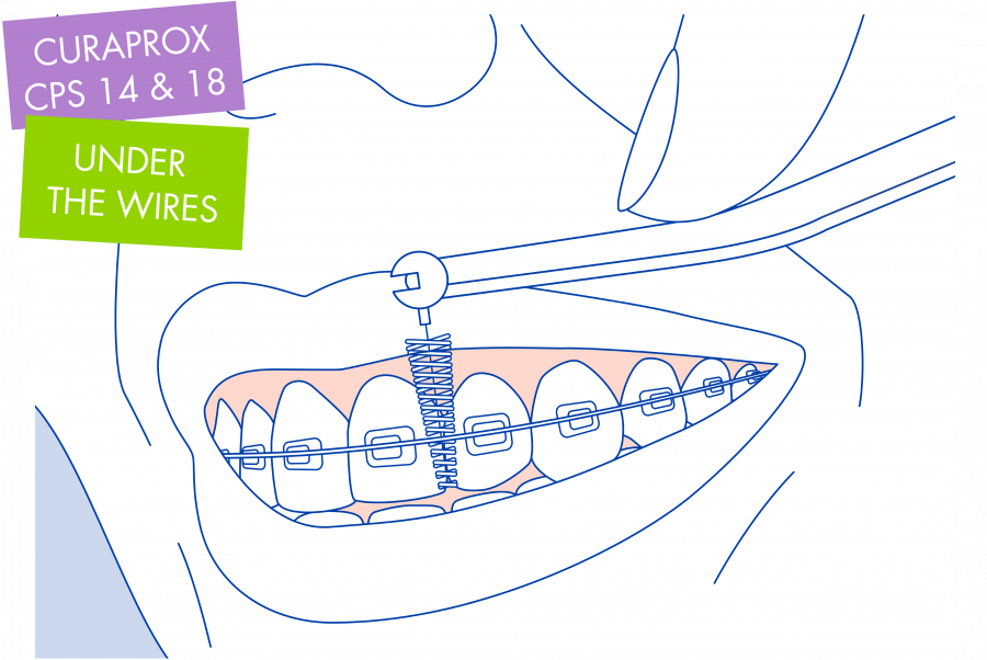 Használd a kúp alakú Curaprox CPS 14 fogköztiszító kefét, amelyet kifejezetten, a drótok mögött és a brackettek között történő tisztításra terveztek. Ha a fogak közötti rések nagyobbak, akkor a CPS 18 fogköztisztító kefénk használatát javasoljuk, mely normál alakú és még hosszabb szálakkal rendelkezik.