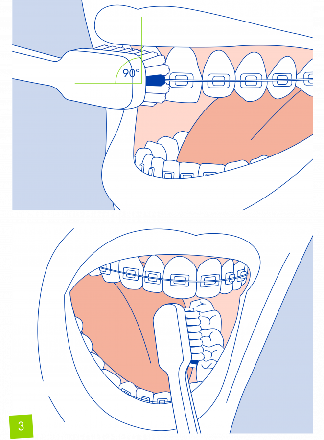 Ezt követően először a brekettek tetejét, majd pedig az alját tisztítsd meg! Haladj végig a fogak és a brekettek mentén a fogkefével és tartsd a 45 fokos szöget ügyelve arra, hogy elkerüld a vízszintes mozgásokat!